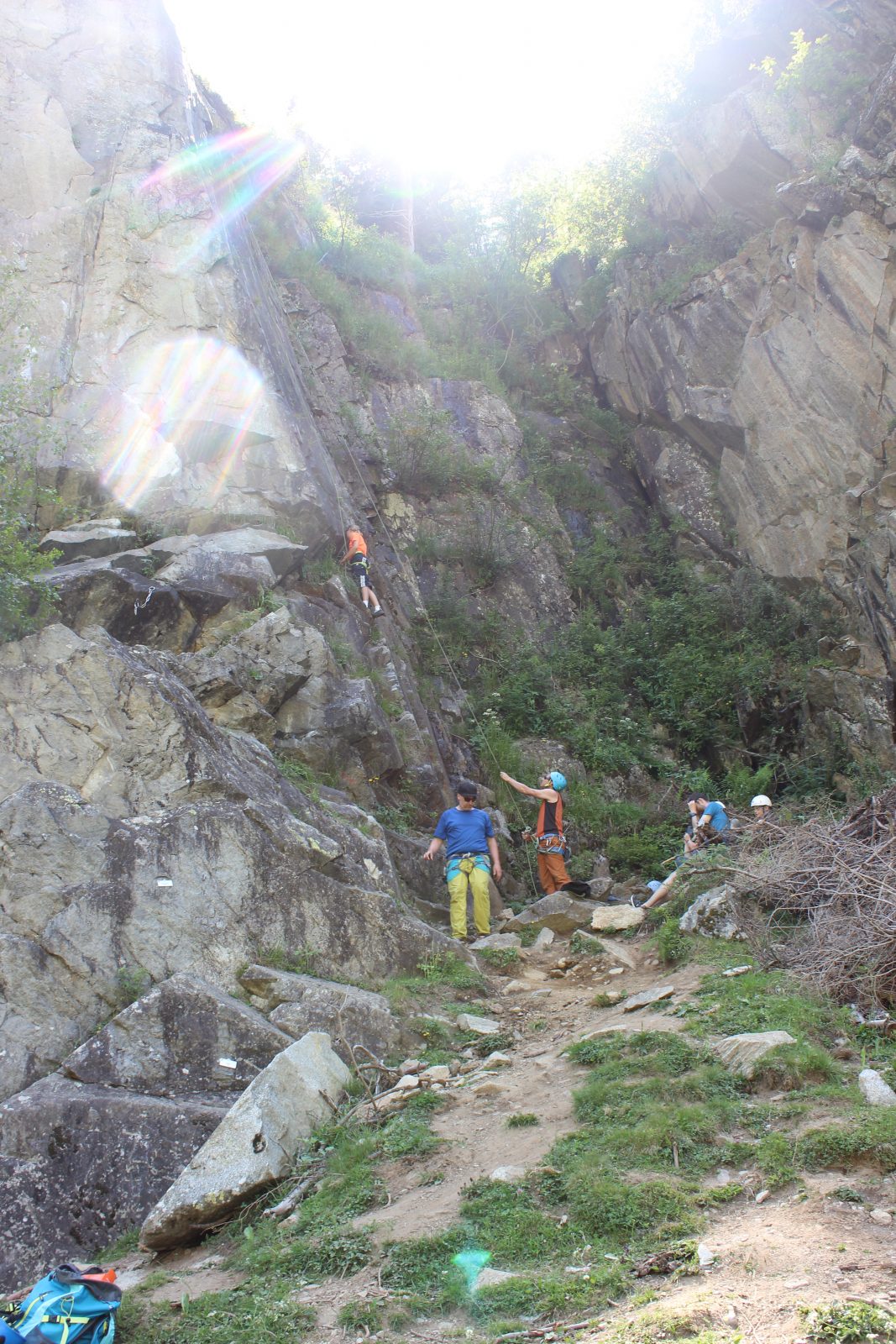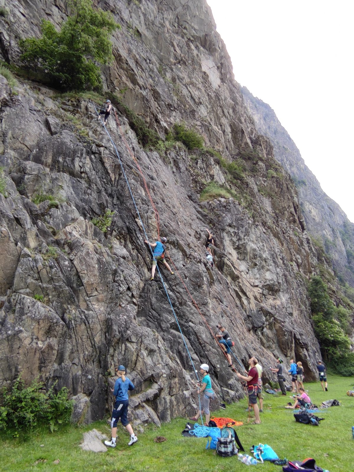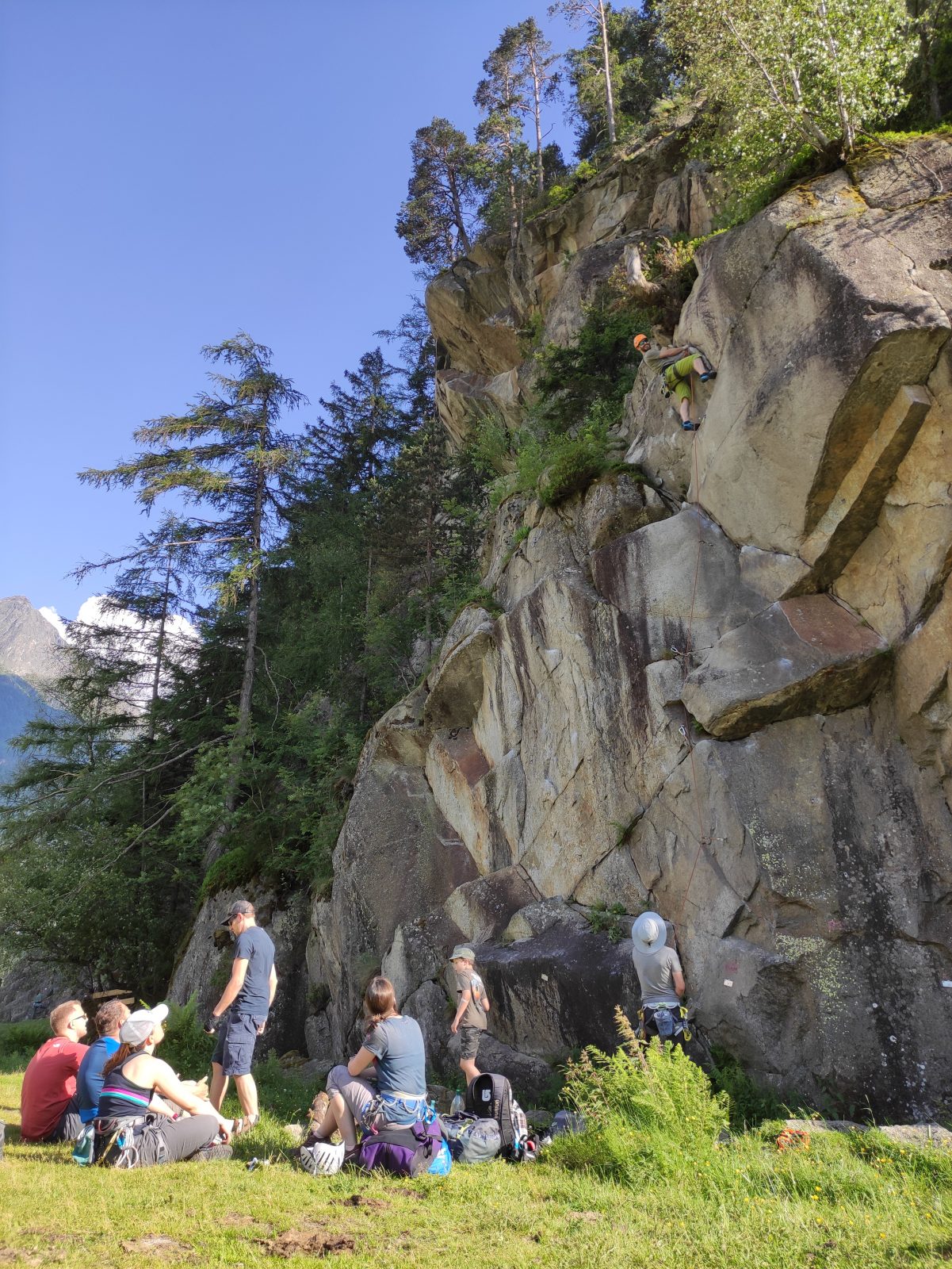 Die Klettergruppe wiederum fuhr zum Klettergarten „Engelswand“ bei Umhausen, etwas weiter vorne im Ötztal. Auch dieser Fels ist bestens erschlossen und bietet über 70 Kletterrouten in allen Schwierigkeitsbereichen. Hier wurden auch einige recht anspruchsvolle Routen gezogen. Nachdem sich die Sonne kräftig auf den Fels gelegt hatte ging ein Teil zurück für eine Wanderung, der Rest schaute sich noch den Klettergarten bei Sautens an.